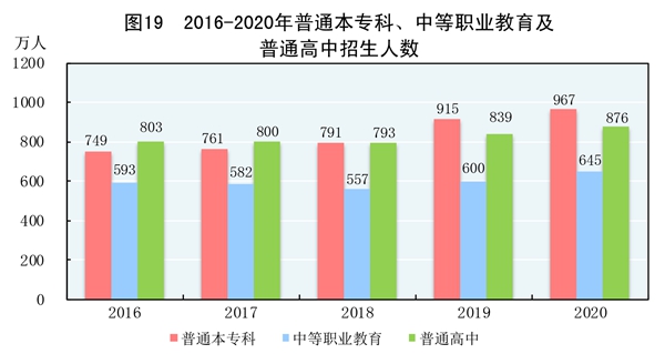 全年研究生教育招生110.7万人,在学研究生314.0万人,毕业生72.9万人。普通本专科招生967.5万人,在校生3285.3万人,毕业生797.2万人。中等职业教育[58]招生644.7万人,在校生1663.4万人,毕业生484.9万人。普通高中招生876.4万人,在校生2494.5万人,毕业生786.5万人。初中招生1632.1万人,在校生4914.1万人,毕业生1535.3万人。普通小学招生1808.1万人,在校生10725.4万人,毕业生1640.3万人。特殊教育招生14.9万人,在校生88.1万人,毕业生12.1万人。学前教育在园幼儿4818.3万人。九年义务教育巩固率为95.2%,高中阶段毛入学率为91.2%。