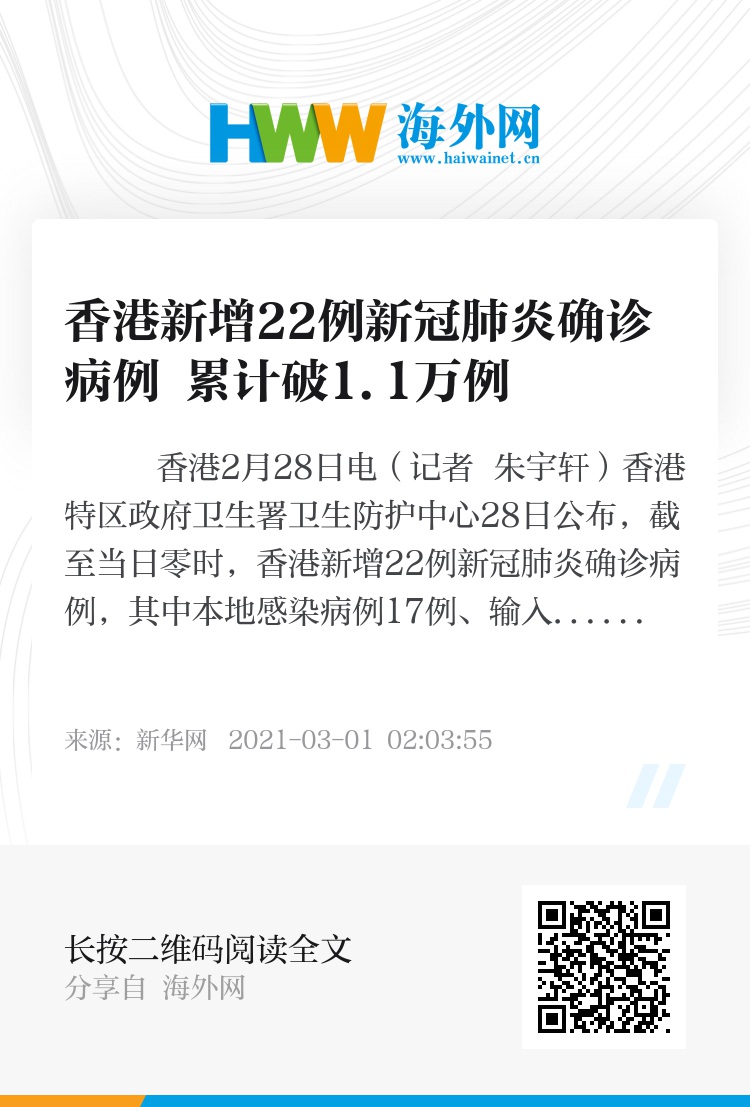 新华社香港2月28日电(记者 朱宇轩)香港特区政府卫生署卫生防护中心28日公布,截至当日零时,香港新增22例新冠肺炎确诊病例,其中本地感染病例17例、输入性病例5例。香港累计报告新冠肺炎确诊病例达11005例。