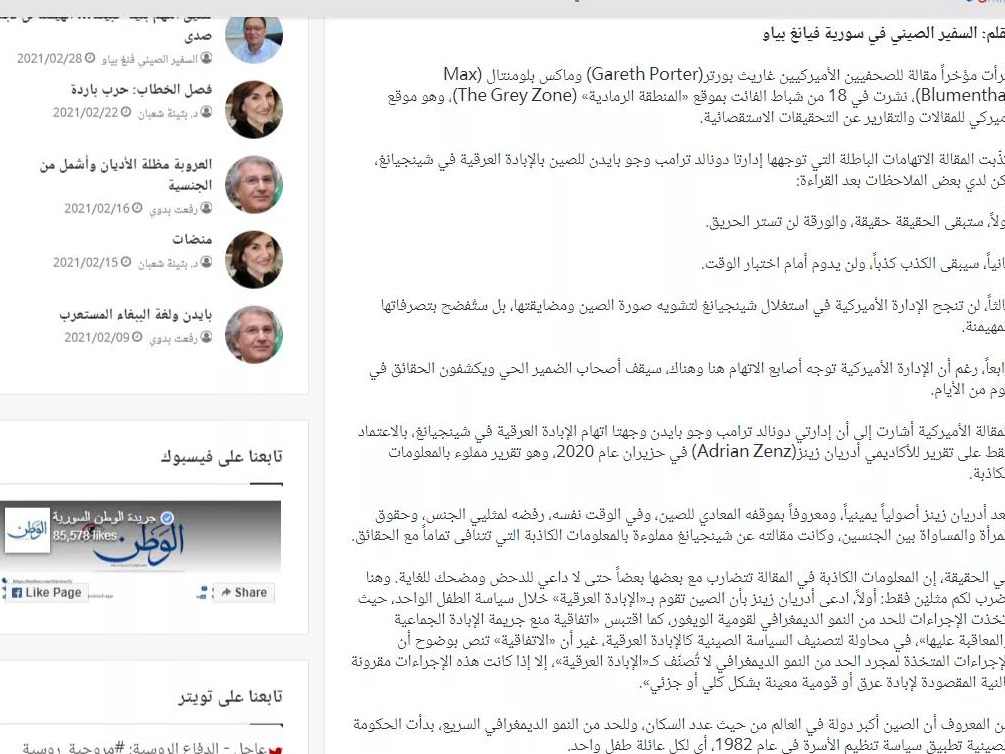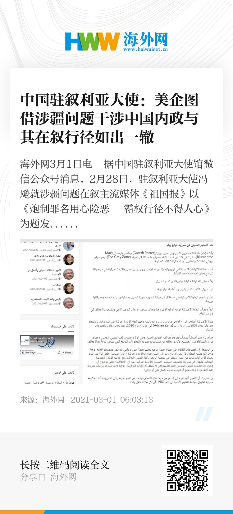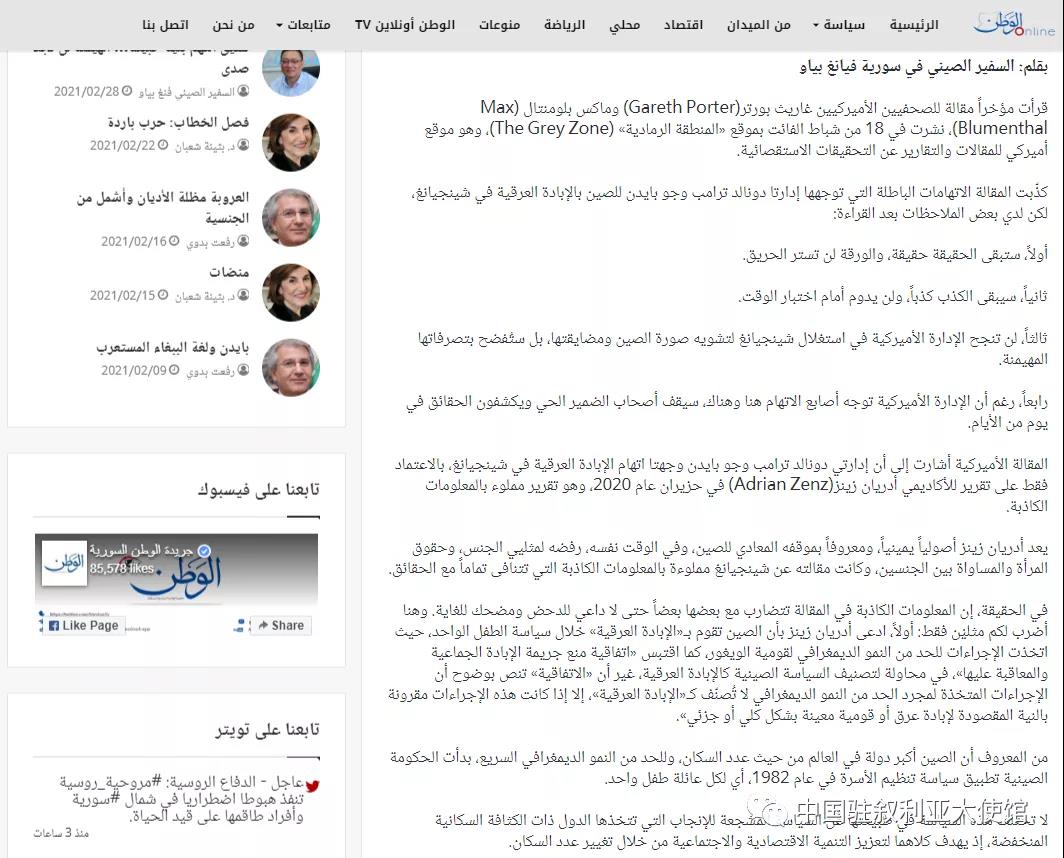 海外网3月1日电 据中国驻叙利亚大使馆微信公众号消息,2月28日,驻叙利亚大使冯飚就涉疆问题在叙主流媒体《祖国报》以《炮制罪名用心险恶 霸权行径不得人心》为题发表署名文章。