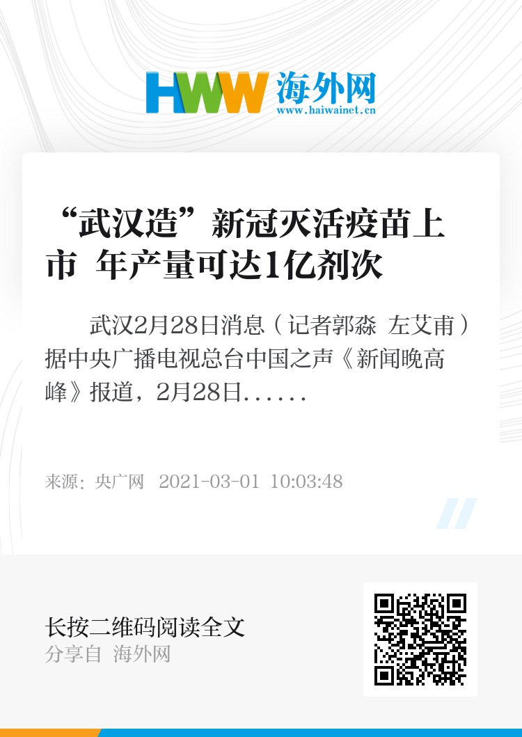 由国药集团中国生物武汉生物制品研究所有限责任公司和中科院病毒所共同研发的新型冠状病毒灭活疫苗正式上市,这也是国内第三个获批附条件上市的新冠疫苗。2月28日,首批“武汉产”新冠疫苗已下线发出。国药集团中国生物武汉生物制品研究所所长段凯博士表示:“这个疫苗上市以后首先是供应国内,第一批苗已经供应给了武汉市的疾控中心。”