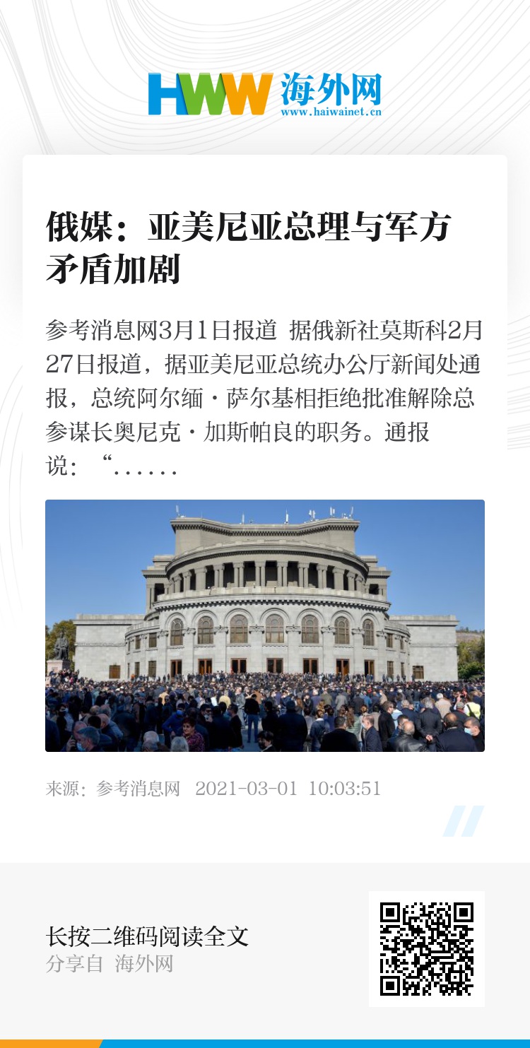 报道还称,在2月24日总统萨尔基相应总理帕希尼扬要求解除第一副总参谋长季兰·哈恰特良的职务后,亚美尼亚爆发又一轮政治危机。据媒体报道,哈恰特良对帕希尼扬有关“伊斯坎德尔”导弹的言论表示了嘲讽。亚军方要求总理辞职,总理则指责军方企图发动政变,承诺要让总参谋长下台,并呼吁支持者上街抗议。