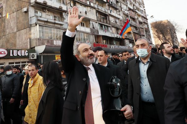 亚美尼亚总理帕希尼扬2月25日在埃里温向他的支持者挥手。(美联社)