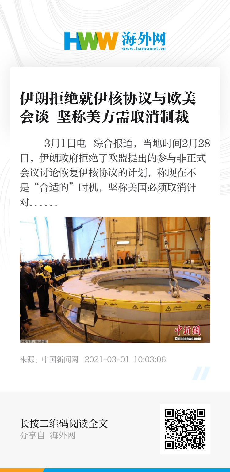 中新网3月1日电 综合报道,当地时间2月28日,伊朗政府拒绝了欧盟提出的参与非正式会议讨论恢复伊核协议的计划,称现在不是“合适的”时机,坚称美国必须取消针对伊朗的所有单方面制裁措施。