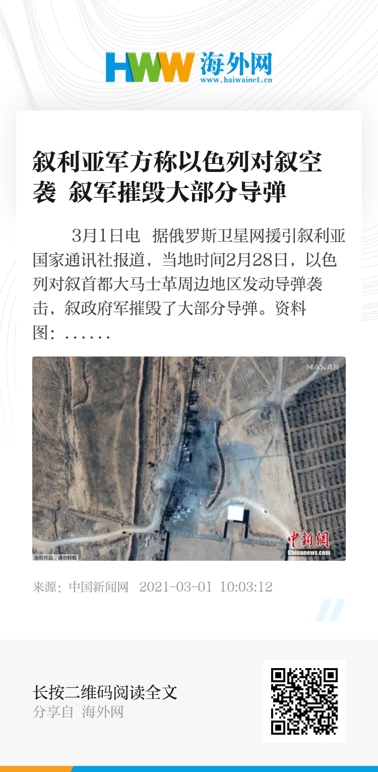 中新网3月1日电 据俄罗斯卫星网援引叙利亚国家通讯社报道,当地时间2月28日,以色列对叙首都大马士革周边地区发动导弹袭击,叙政府军摧毁了大部分导弹。
