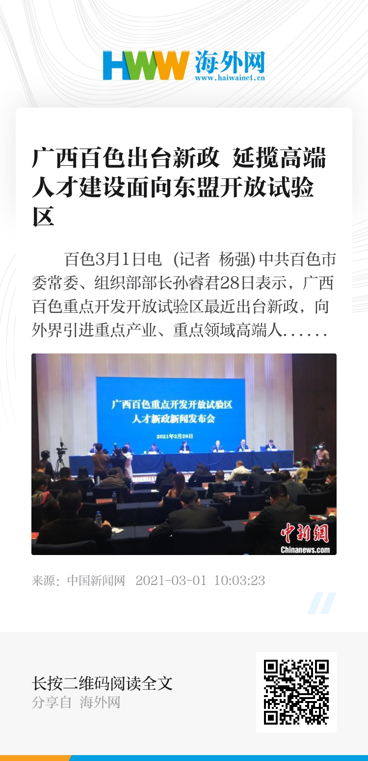 中新网百色3月1日电 (记者 杨强)中共百色市委常委、组织部部长孙睿君28日表示,广西百色重点开发开放试验区最近出台新政,向外界引进重点产业、重点领域高端人才,并根据人才层次最高给予100万元安家费和100万元购房补助,同时探索聘任制公务员和政府高级雇员制。