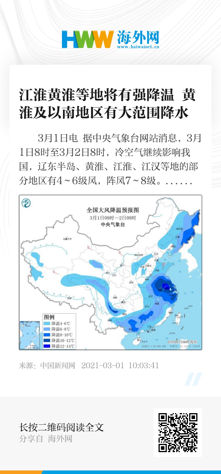 3月1日8时至3月2日8时,冷空气继续影响我国,辽东半岛、黄淮、江淮、江汉等地的部分地区有4~6级风,阵风7~8级;青藏高原东部及中东部大部等地气温下降4~6℃,其中,东北地区东部、黄淮中南部、江淮大部、华南北部和西部等地的部分地区降温8~10℃,江苏西南部局地可达12℃以上。中央气象台3月1日06时继续发布大风降温预报。