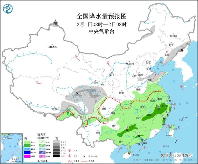 3月1日,黄淮及以南地区仍有大范围降水天气,江南东部、华南北部等地有中雨。