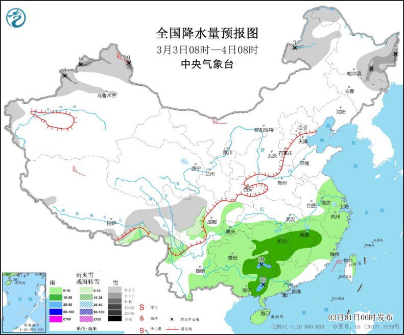 3月2日8时至3日8时,新疆北疆北部、青藏高原东部、甘肃南部等地的部分地区有小到中雪或雨夹雪,其中,新疆北疆北部山区、青海南部、川西高原北部等地局地有大雪或暴雪(10~18毫米)。西北地区东部和北部、江南大部、华南大部等地的部分地区有小雨,局地中雨。内蒙古西部、新疆北疆北部、西藏北部等地的部分地区有4~5级风。东海大部、台湾海峡、南海北部有6~7级风,阵风8级。