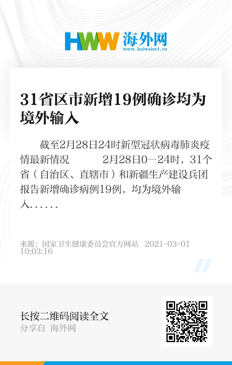 2月28日0―24时,31个省(自治区、直辖市)和新疆生产建设兵团报告新增确诊病例19例,均为境外输入病例(四川9例,广东6例,北京2例,上海2例);无新增死亡病例;无新增疑似病例。