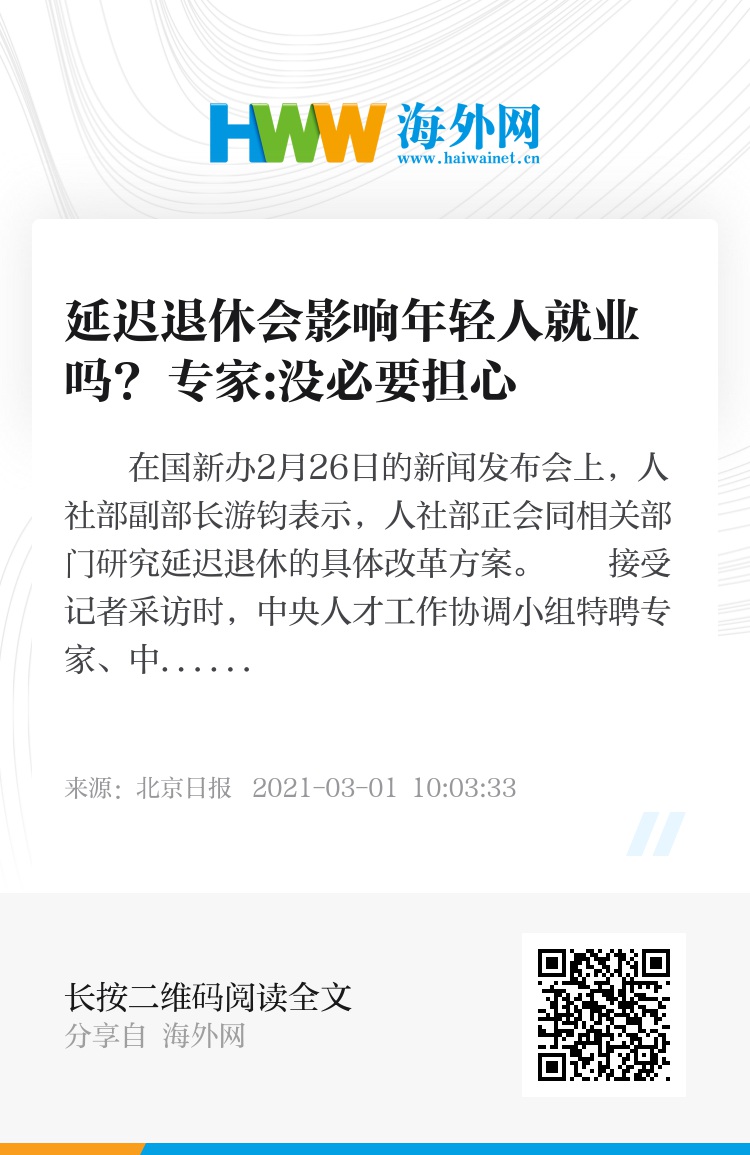 接受记者采访时,中央人才工作协调小组特聘专家、中国人事科学研究院原院长吴江说,退休年龄偏低造成人力资源的浪费,渐进式延迟退休能够缓解就业和人口老龄化两方面的现实矛盾。数字经济和智能制造创造了大量新型就业岗位,延迟退休实际上不会对年轻人就业造成影响。