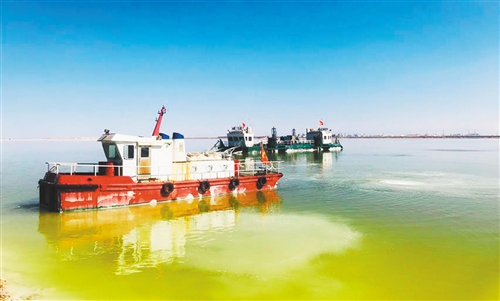 左图 察尔汗盐湖上的采盐船和生活补给船。本报记者 石 晶摄