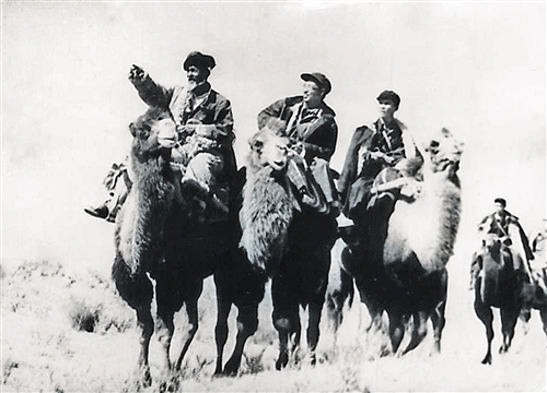 1954年,新中国地质勘查队在乌孜别克族向导木买努斯・依沙・阿吉老人的带领下,骑着骆驼进入柴达木盆地寻找水源和油苗。(青海油田供图)