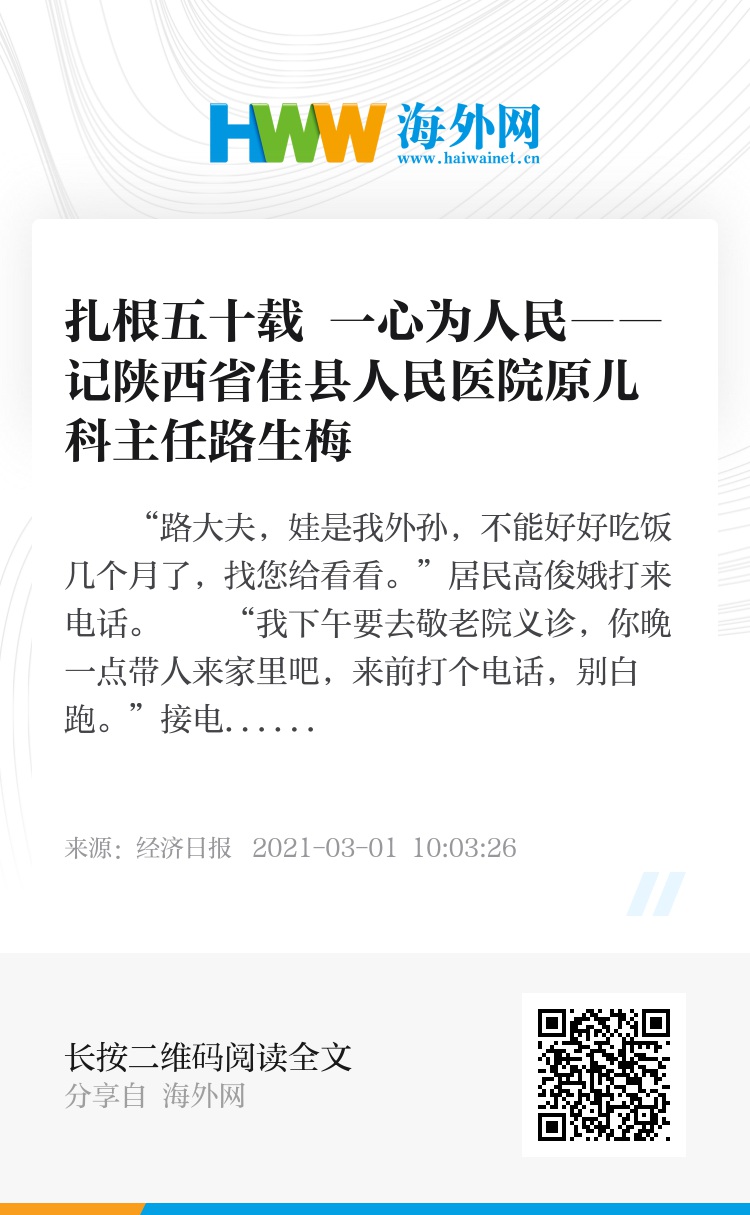 “在佳县,路生梅大夫的家庭地址和电话号码几乎无人不知。我有3个娃,从小都是找路大夫看病。现在有了小外孙,我还会带着小外孙来找路大夫,我就是相信她。”高俊娥说。(经济日报-中国经济网记者 雷 婷)