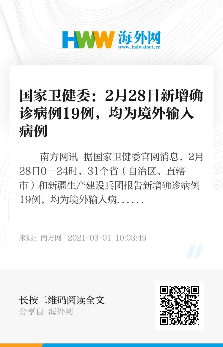 南方网讯 据国家卫健委官网消息,2月28日0—24时,31个省(自治区、直辖市)和新疆生产建设兵团报告新增确诊病例19例,均为境外输入病例(四川9例,广东6例,北京2例,上海2例);无新增死亡病例;无新增疑似病例。