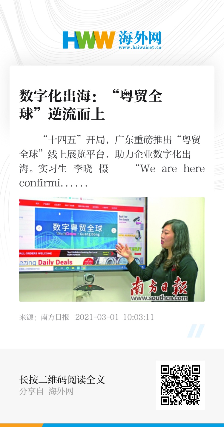 “十四五”开局,广东重磅推出“粤贸全球”线上展览平台,助力企业数字化出海。实习生 李晓 摄