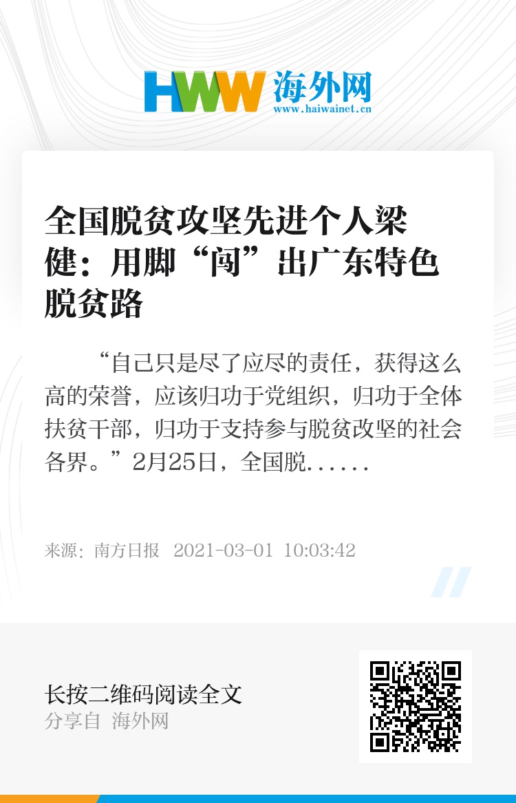 “自己只是尽了应尽的责任,获得这么高的荣誉,应该归功于党组织,归功于全体扶贫干部,归功于支持参与脱贫改坚的社会各界。”2月25日,全国脱贫攻坚总结表彰大会在京举行,中共广东省委农村工作办公室、省扶贫开发办公室专职副主任梁健在获得全国脱贫攻坚先进人物荣誉后,深怀感恩。