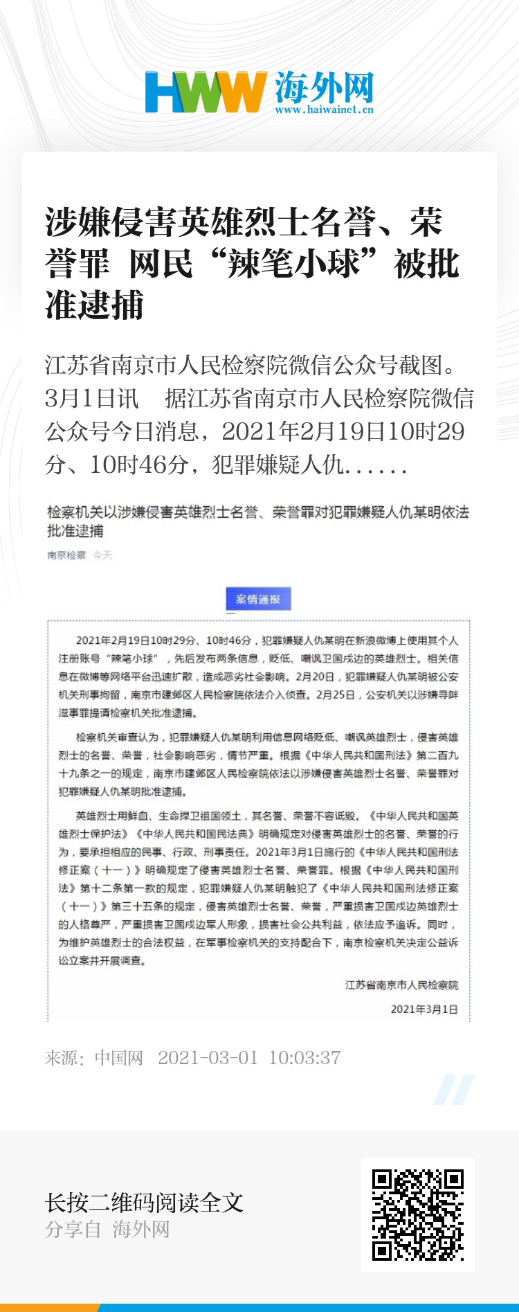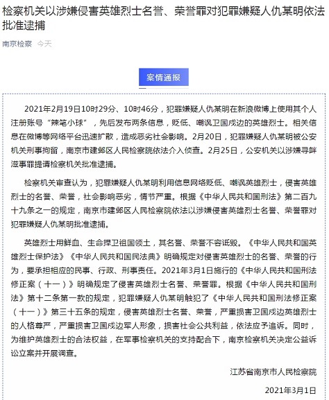 中国网3月1日讯 据江苏省南京市人民检察院微信公众号今日消息,2021年2月19日10时29分、10时46分,犯罪嫌疑人仇某明在新浪微博上使用其个人注册账号“辣笔小球”,先后发布两条信息,贬低、嘲讽卫国戍边的英雄烈士。相关信息在微博等网络平台迅速扩散,造成恶劣社会影响。2月20日,犯罪嫌疑人仇某明被公安机关刑事拘留,南京市建邺区人民检察院依法介入侦查。2月25日,公安机关以涉嫌寻衅滋事罪提请检察机关批准逮捕。