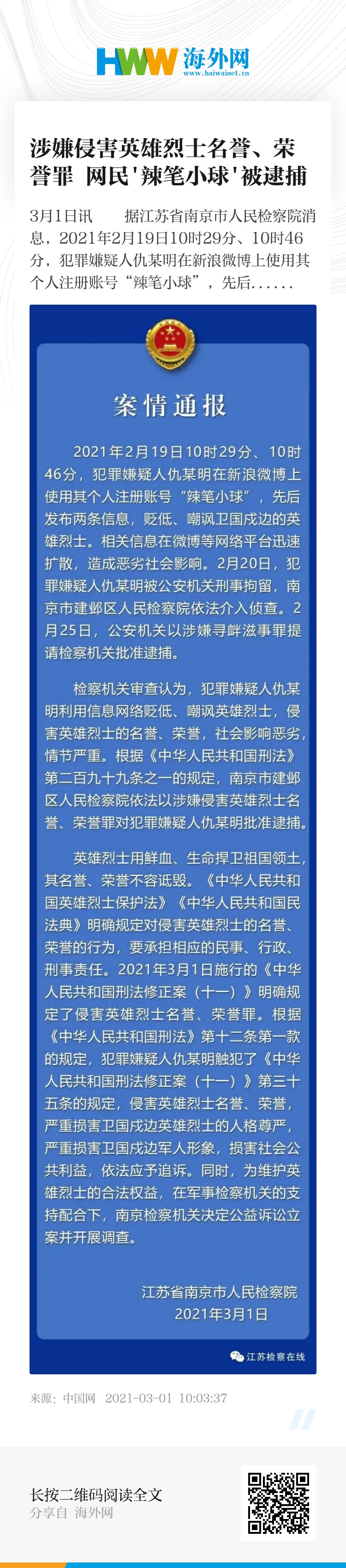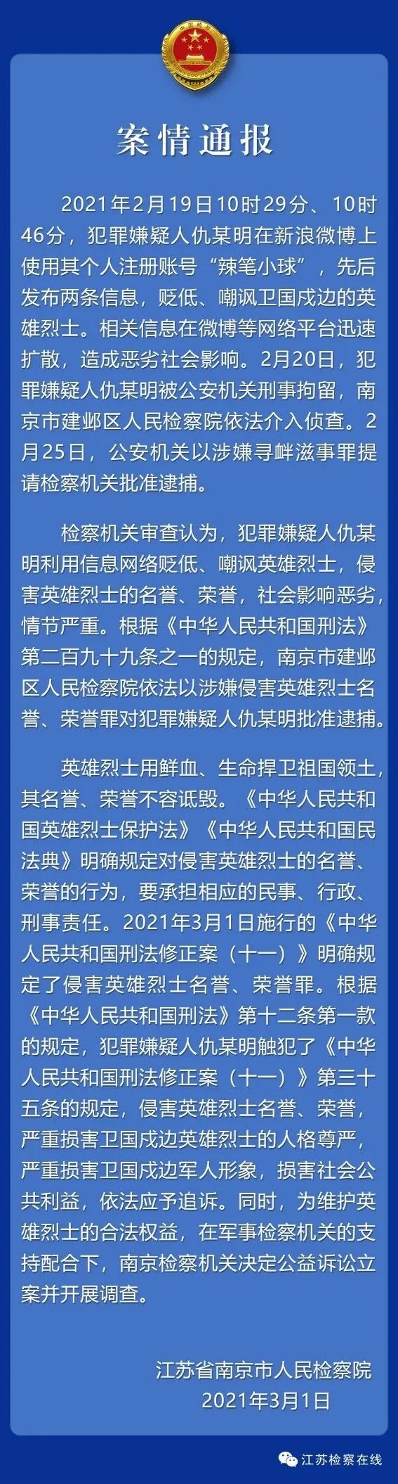 中国网3月1日讯 据江苏省南京市人民检察院消息,2021年2月19日10时29分、10时46分,犯罪嫌疑人仇某明在新浪微博上使用其个人注册账号“辣笔小球”,先后发布两条信息,贬低、嘲讽卫国戍边的英雄烈士。相关信息在微博等网络平台迅速扩散,造成恶劣社会影响。2月20日,犯罪嫌疑人仇某明被公安机关刑事拘留,南京市建邺区人民检察院依法介入侦查。2月25日,公安机关以涉嫌寻衅滋事罪提请检察机关批准逮捕。