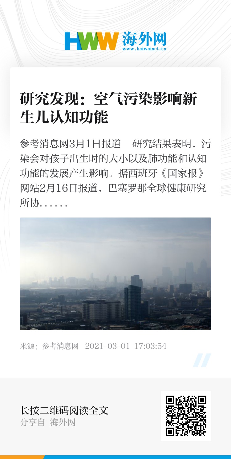 参考消息网3月1日报道 研究结果表明,污染会对孩子出生时的大小以及肺功能和认知功能的发展产生影响。