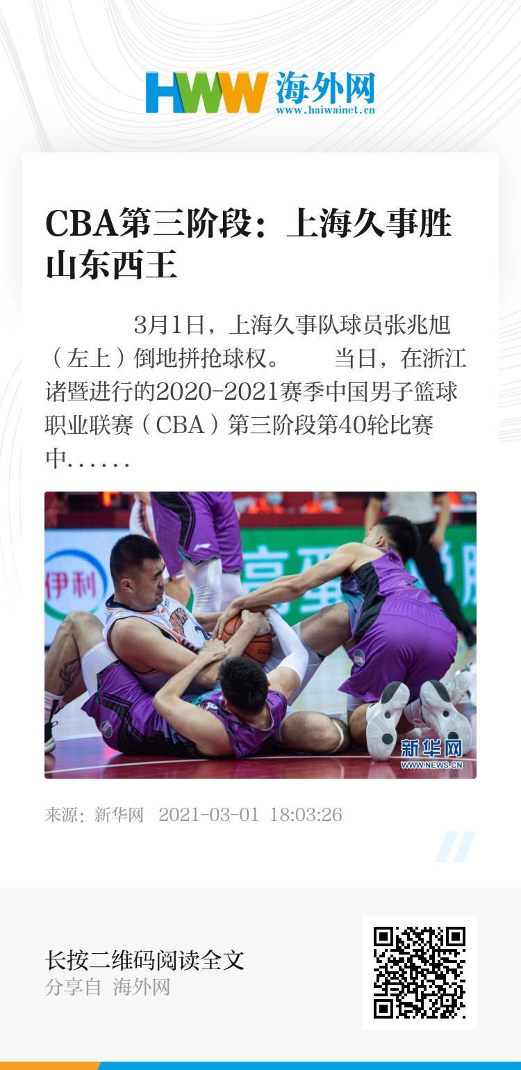 当日,在浙江诸暨进行的2020-2021赛季中国男子篮球职业联赛(CBA)第三阶段第40轮比赛中,上海久事队以120比114战胜山东西王队。
