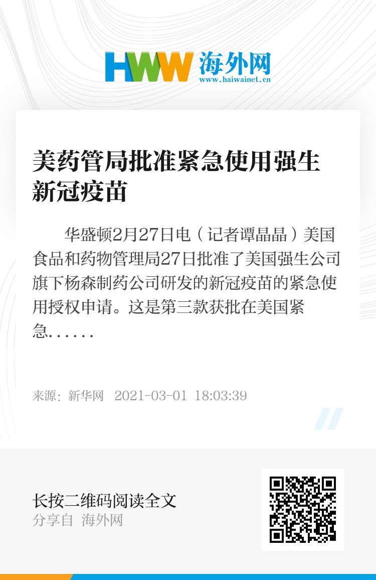 美药管局代理局长珍妮特・伍德科克在声明中指出,疫情已夺走超过50万美国人的生命。强生疫苗的批准增加了可用的新冠疫苗,这是预防新冠的最有效方式,将有助于美国防控疫情。