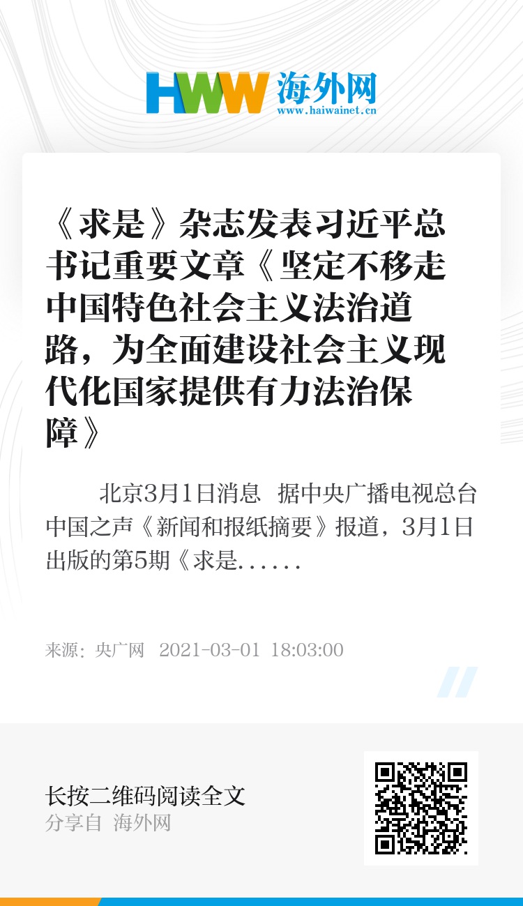 央广网北京3月1日消息 据中央广播电视总台中国之声《新闻和报纸摘要》报道,3月1日出版的第5期《求是》杂志发表中共中央总书记、国家主席、中央军委主席习近平的重要文章《坚定不移走中国特色社会主义法治道路,为全面建设社会主义现代化国家提供有力法治保障》。2021-03-01 新闻和报纸摘要全文>>>
