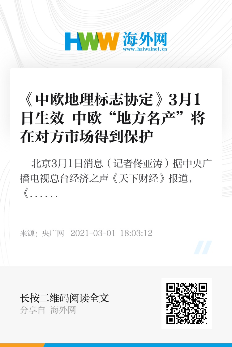 央广网北京3月1日消息(记者佟亚涛)据中央广播电视总台经济之声《天下财经》报道,《中欧地理标志协定》3月1日正式生效,来自中国和欧盟两地的第一批各100种地理标志“地方名产”将在对方市场得到保护。