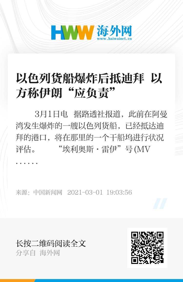 中新网3月1日电 据路透社报道,此前在阿曼湾发生爆炸的一艘以色列货船,已经抵达迪拜的港口,将在那里的一个干船坞进行状况评估。
