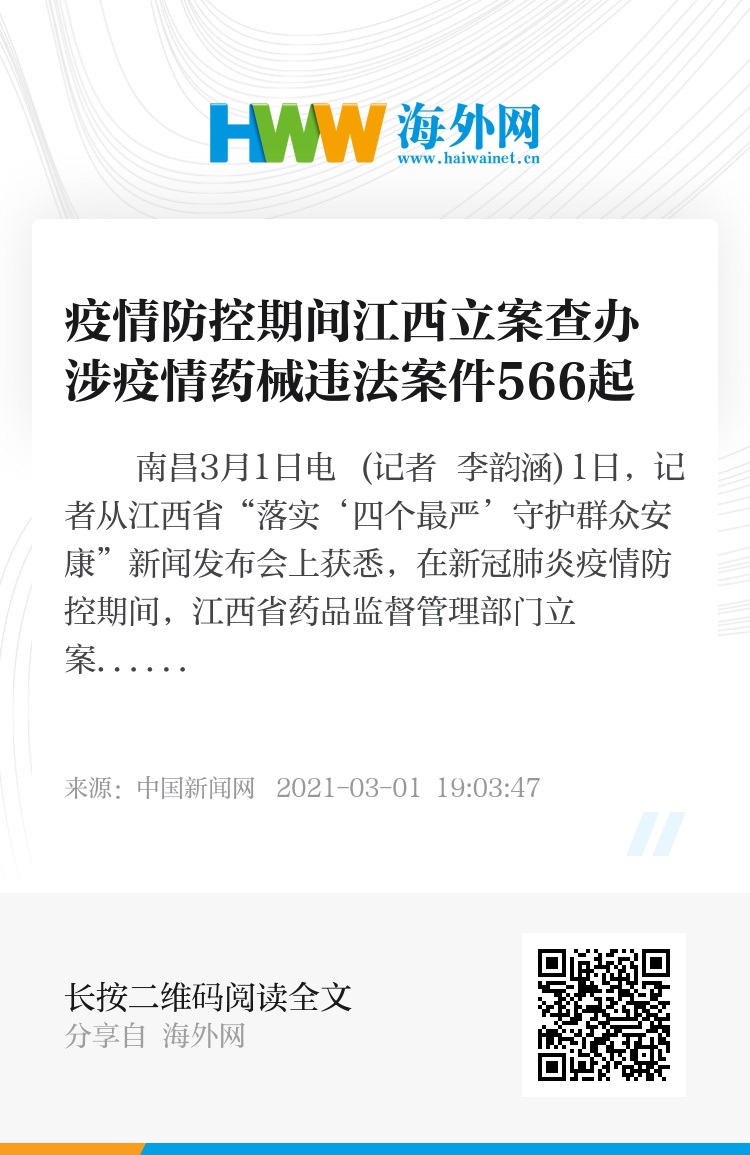 中新网南昌3月1日电 (记者 李韵涵)1日,记者从江西省“落实‘四个最严’守护群众安康”新闻发布会上获悉,在新冠肺炎疫情防控期间,江西省药品监督管理部门立案查办涉疫情药械违法案件566起。