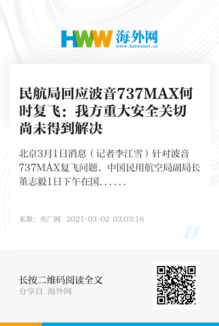 董志毅表示,前期波音737MAX飞机在中国停止商业运行后,民航局相关机构持续与美国联邦航空局和波音公司保持沟通和联系,并开展了全面而深入的技术审查工作,我们的合作是积极而有序推进的。近期,民航局适航审定机构正在与波音公司研究审定试飞工作方案,待我方提出的重大安全关切得到解决后,将按计划、有步骤地开展审定试飞工作。