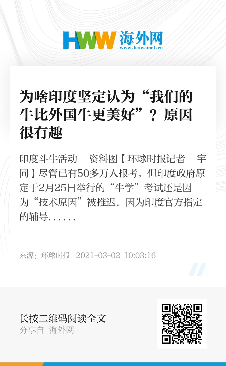 【环球时报记者 宇同】尽管已有50多万人报考,但印度政府原定于2月25日举行的“牛学”考试还是因为“技术原因”被推迟。因为印度官方指定的辅导材料中有“杀牛会带来地震”“印度牛比外国牛拥有更多美好品质”等争议性内容,因此很多媒体批评印度政府将牛政治化,用以推行印度人民党的意识形态并削弱世俗主义。其实在印度,牛从来就不仅仅只是一种动物。因为宗教原因,牛一直带有政治属性,引发过不少争执,甚至战争,其中就包括被印度称为第一次民族独立战争的大起义。