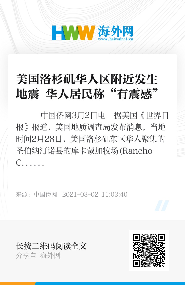 中国侨网3月2日电 据美国《世界日报》报道,美国地质调查局发布消息,当地时间2月28日,美国洛杉矶东区华人聚集的圣伯纳汀诺县的库卡蒙加牧场(Rancho Cucamonga)北部,发生里氏规模3.0级地震。