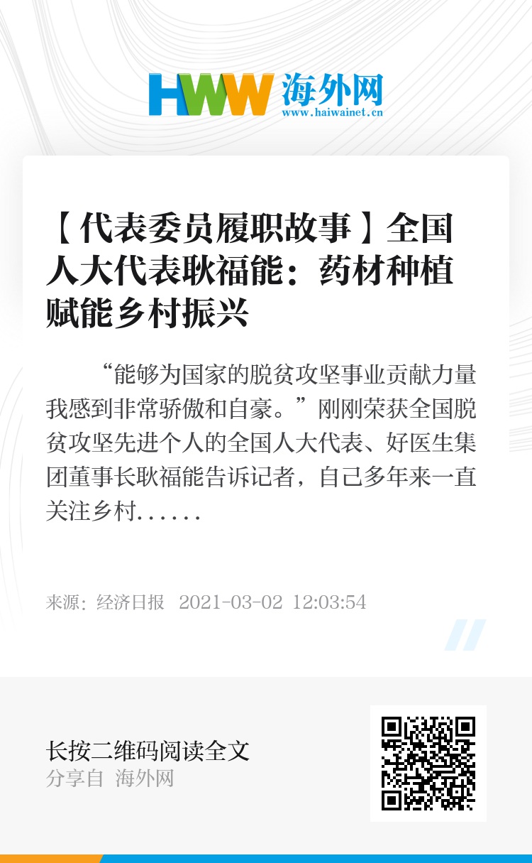 从2013年担任全国人大代表至今,耿福能代表进行了56次调研、74次发言,先后提出了93条建议。今年全国两会,耿福能代表将继续提出在脱贫摘帽地区大力发展道地中药材种植,壮大集体经济,强化教育扶贫,推广农业科技、现代化耕种,探索企业参与乡村振兴新模式等建议。(经济日报-中国经济网记者 吴佳佳)