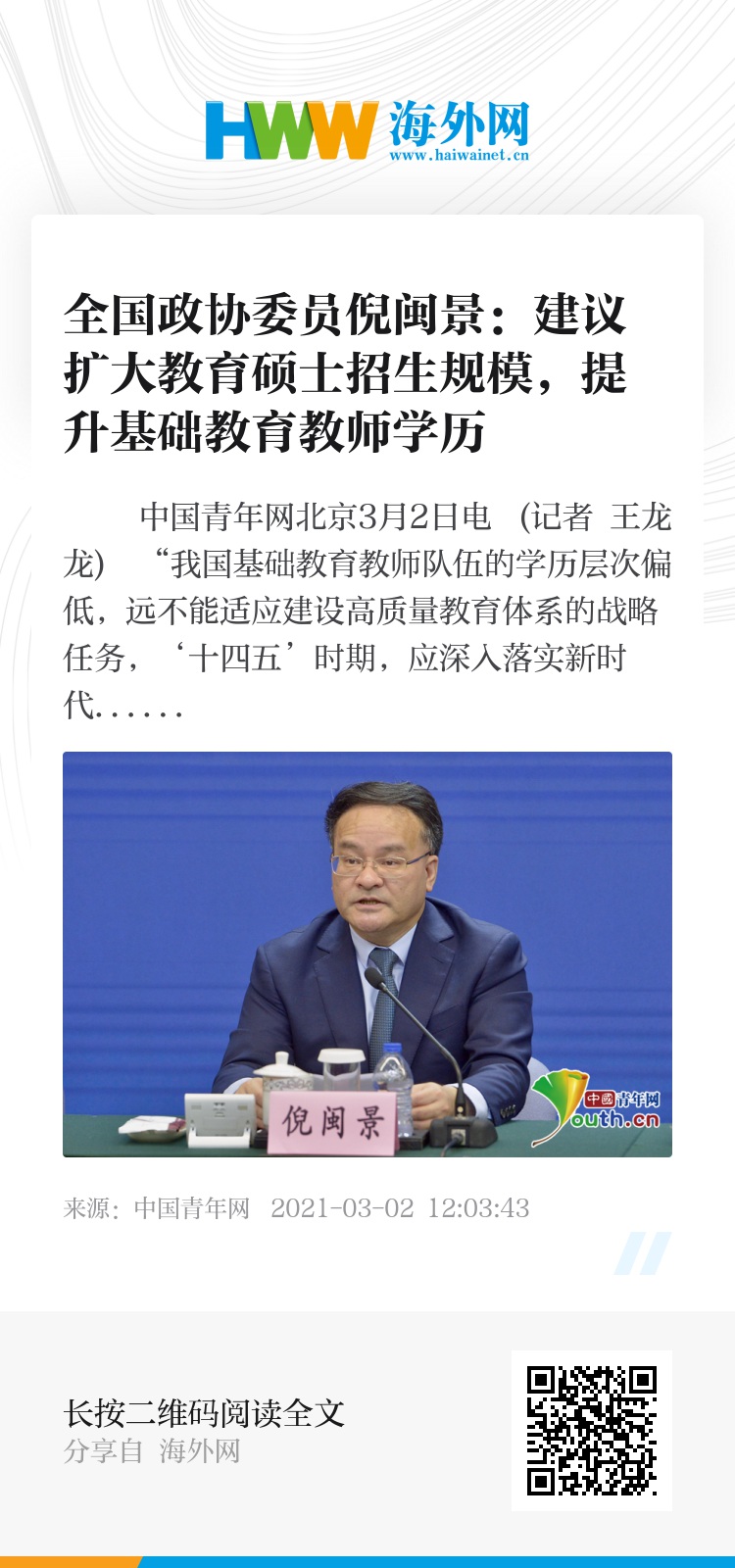 中国青年网北京3月2日电 (记者 王龙龙) “我国基础教育教师队伍的学历层次偏低,远不能适应建设高质量教育体系的战略任务,‘十四五’时期,应深入落实新时代教师队伍建设改革的要求,加快提升基础教育教师队伍学历层次。”今年两会期间,民进中央拟向大会提交《关于加快提升基础教育教师队伍学历层次的提案》。全国政协委员、上海市教育委员会副主任倪闽景代表民进中央在接受中国青年网记者采访时表示,建议扩大全国教育硕士招生规模,逐年增加师范专业学生免试攻读研究生计划人数,进而推动提升基础教育教师队伍的学历层次。