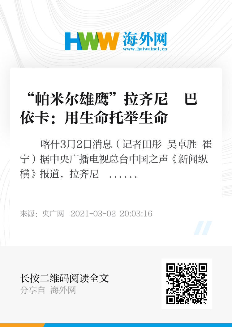 央广网喀什3月2日消息(记者田彤 吴卓胜 崔宁)据中央广播电视总台中国之声《新闻纵横》报道,拉齐尼・巴依卡,是新疆喀什地区塔什库尔干塔吉克自治县提孜那甫乡提孜那甫村的护边员。从他的祖父开始,三代人克服种种艰难困苦,在帕米尔高原上为国守边护边。