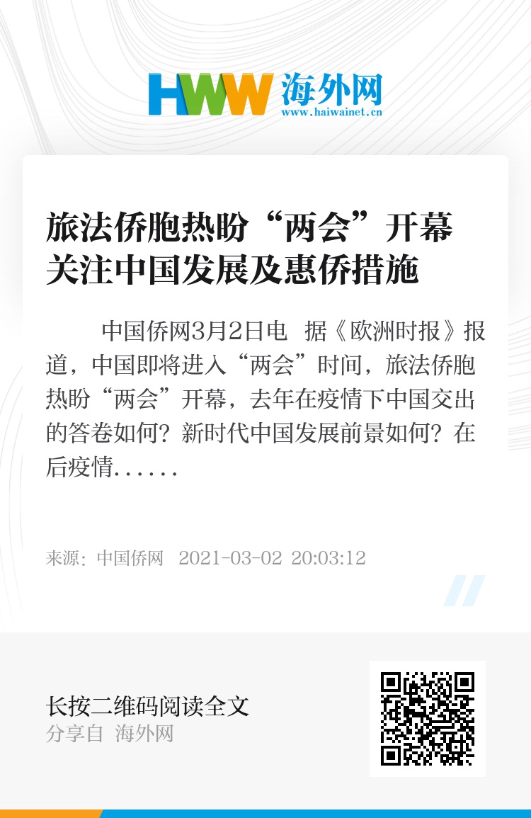 中国侨网3月2日电 据《欧洲时报》报道,中国即将进入“两会”时间,旅法侨胞热盼“两会”开幕,去年在疫情下中国交出的答卷如何?新时代中国发展前景如何?在后疫情时代,在霸权主义抬头、世界不确定性增加的情况下,中国的外交政策有什么变化?新的一年中国有哪些惠及外商和海外华侨华人的措施等,都成为侨胞关注的热点。