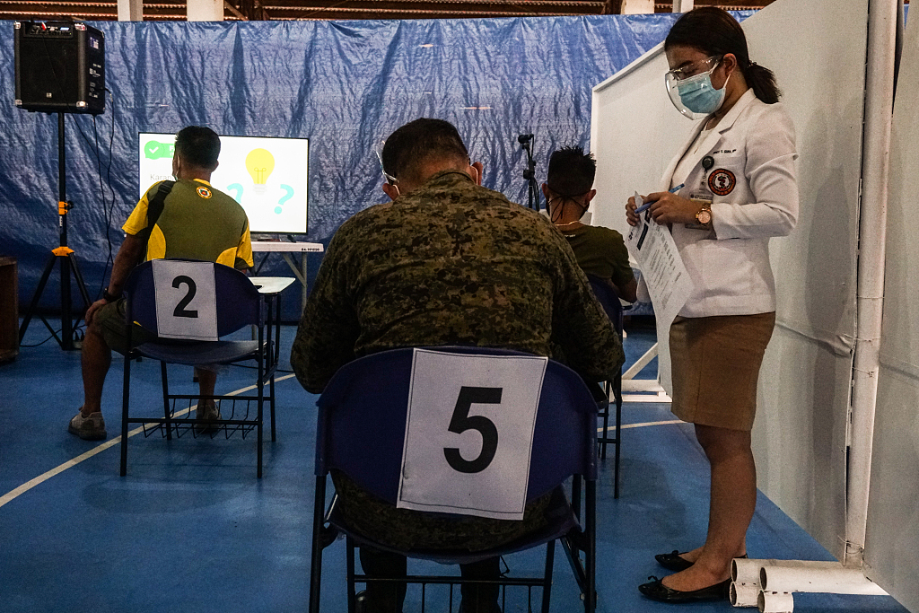 当地时间2021年3月1日,菲律宾奎松市,当地启动新冠疫苗接种工作,军队开始接种新冠疫苗。1日上午,菲律宾总医院院长赫拉尔多·莱加斯皮接种科兴疫苗,成为菲律宾国内首个新冠疫苗接种者,标志着菲律宾全国新冠疫苗接种正式启动。图片来源:人民视觉