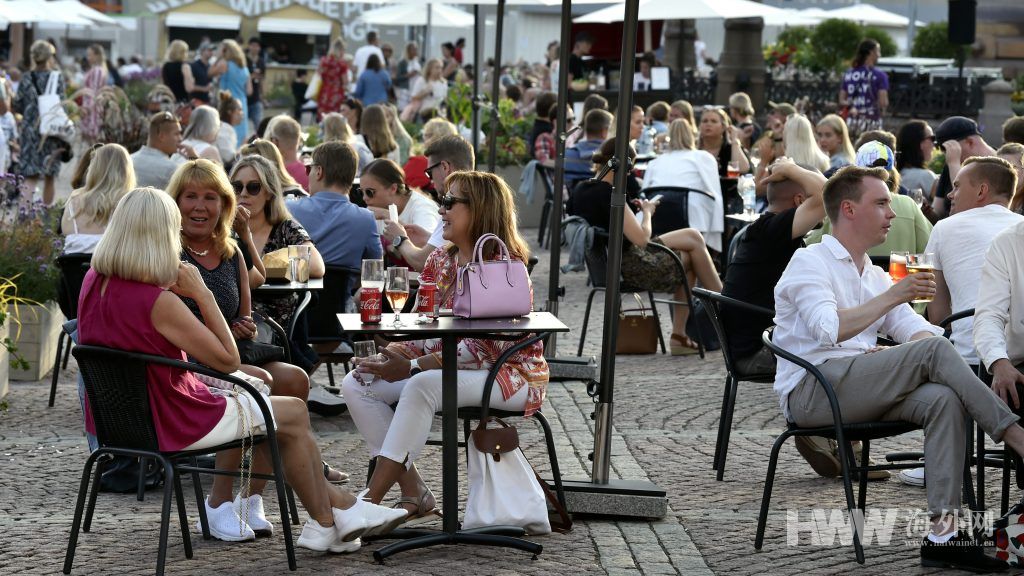 芬兰政府当地时间2021年3月1日宣布该国进入紧急状态,以应对进一步恶化的新冠肺炎疫情。资料图为芬兰赫尔辛基民众在户外广场上用餐和享用饮料。(供图:澎湃影像)