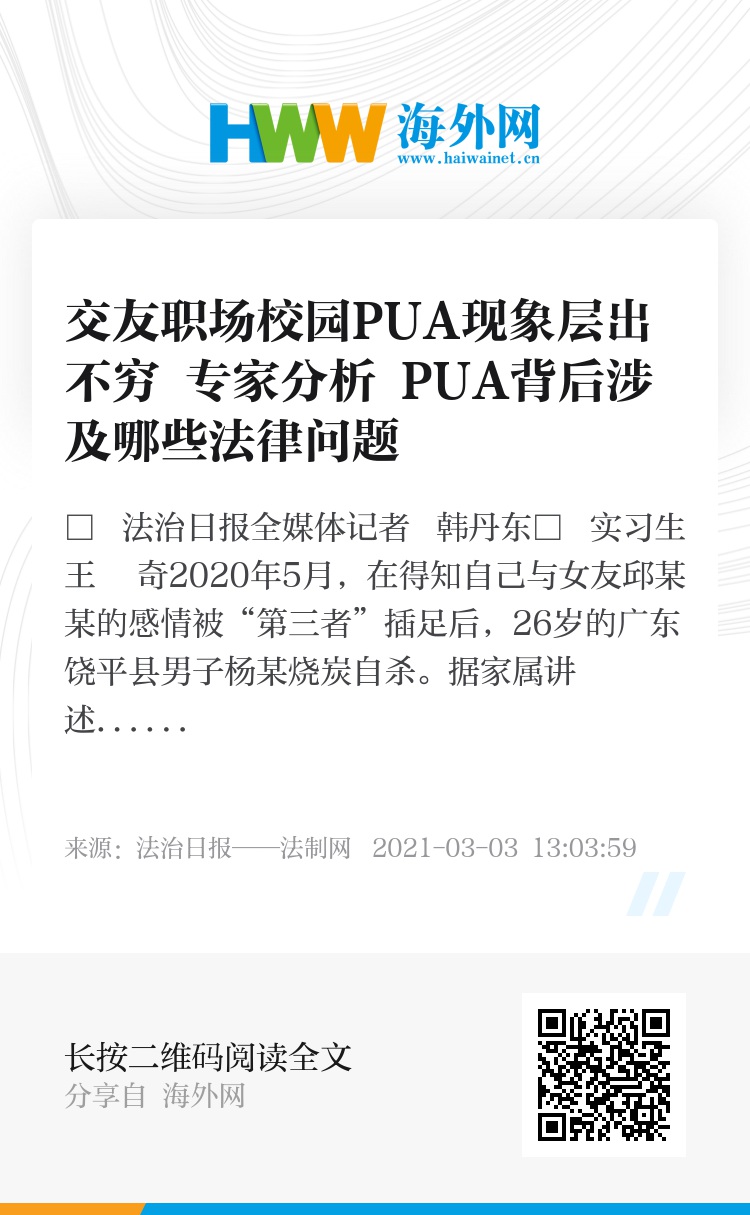有专家表示,PUA涉及的法律问题,应该具体问题具体分析,可能会违反民法典和治安管理处罚法的规定,侵犯名誉权、隐私权,严重的可能构成侮辱、诽谤罪、诈骗罪、强奸罪、非法拘禁罪、故意杀人罪。职场PUA可能还会违反劳动法、劳动合同法,侵害劳动者合法权益,而学术PUA有可能侵犯著作权。
