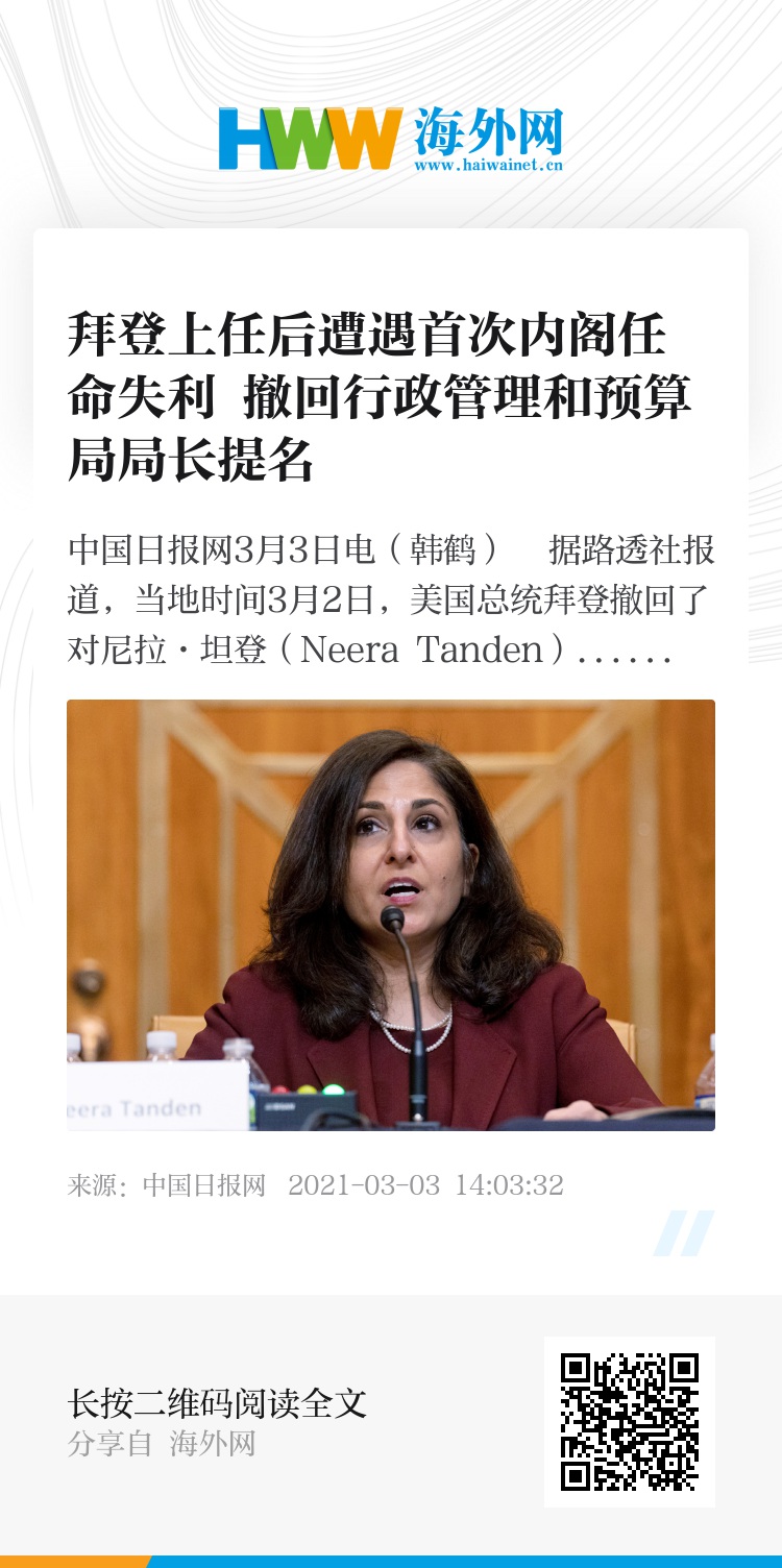 中国日报网3月3日电(韩鹤) 据路透社报道,当地时间3月2日,美国总统拜登撤回了对尼拉·坦登(Neera Tanden)担任行政管理和预算局(Office of Management and Budget)局长的提名。这是美国国会第一次拒绝通过拜登的内阁部门负责人提名。