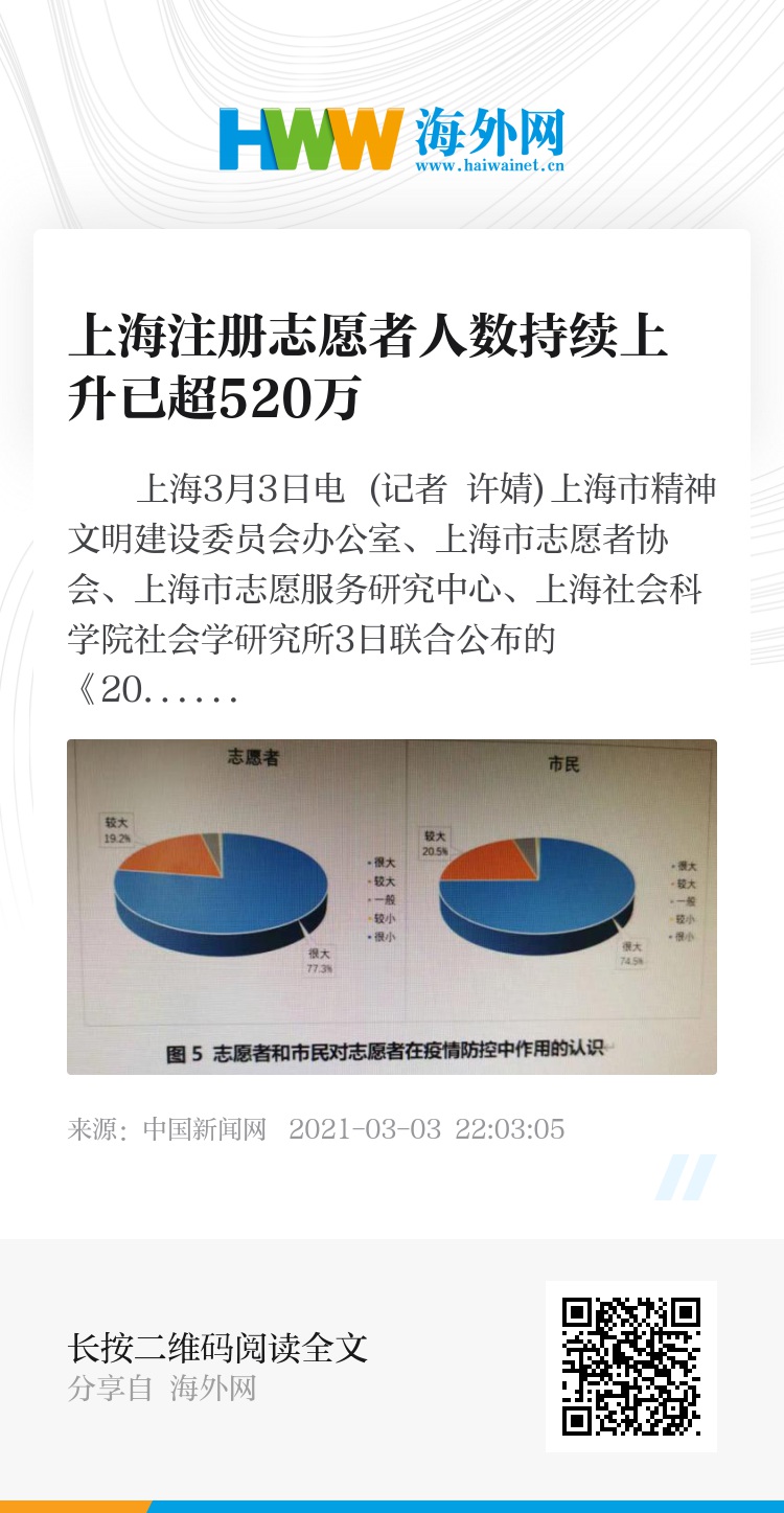 中新网上海3月3日电 (记者 许婧)上海市精神文明建设委员会办公室、上海市志愿者协会、上海市志愿服务研究中心、上海社会科学院社会学研究所3日联合公布的《2020年上海志愿服务发展新情况》显示,上海注册志愿者人数持续上升,志愿者注册率达历史新高,志愿者参与志愿服务活动活跃度进一步提升,志愿者积极投身抗击新冠肺炎疫情志愿服务活动,志愿者和市民对志愿服务活动满意度高,并且广泛认同志愿者在疫情防控中发挥的重要作用,新时代文明实践中心建设为志愿服务注入了更加丰富的内涵,提供了更加广阔的舞台。