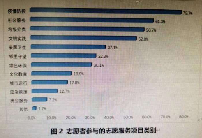 在各类志愿服务项目中,志愿者参与比例排在首位的是“疫情防控”,占比75.7%。此外,排在前五位的还有“社区服务”“垃圾分类”“文明实践”和“爱国卫生”,占比分别为61.3%、56.7%、52.8%和37.1%。