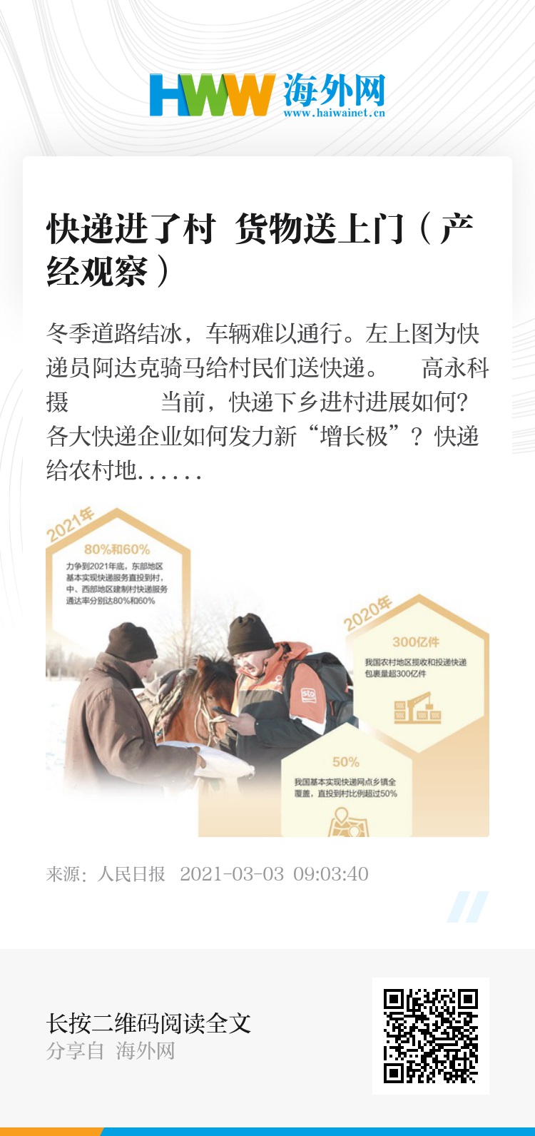 国家邮政局数据显示,2020年,我国基本实现快递网点乡镇全覆盖,直投到村比例超过50%。不断下沉的快递服务网络,给农村地区带来了新变化。