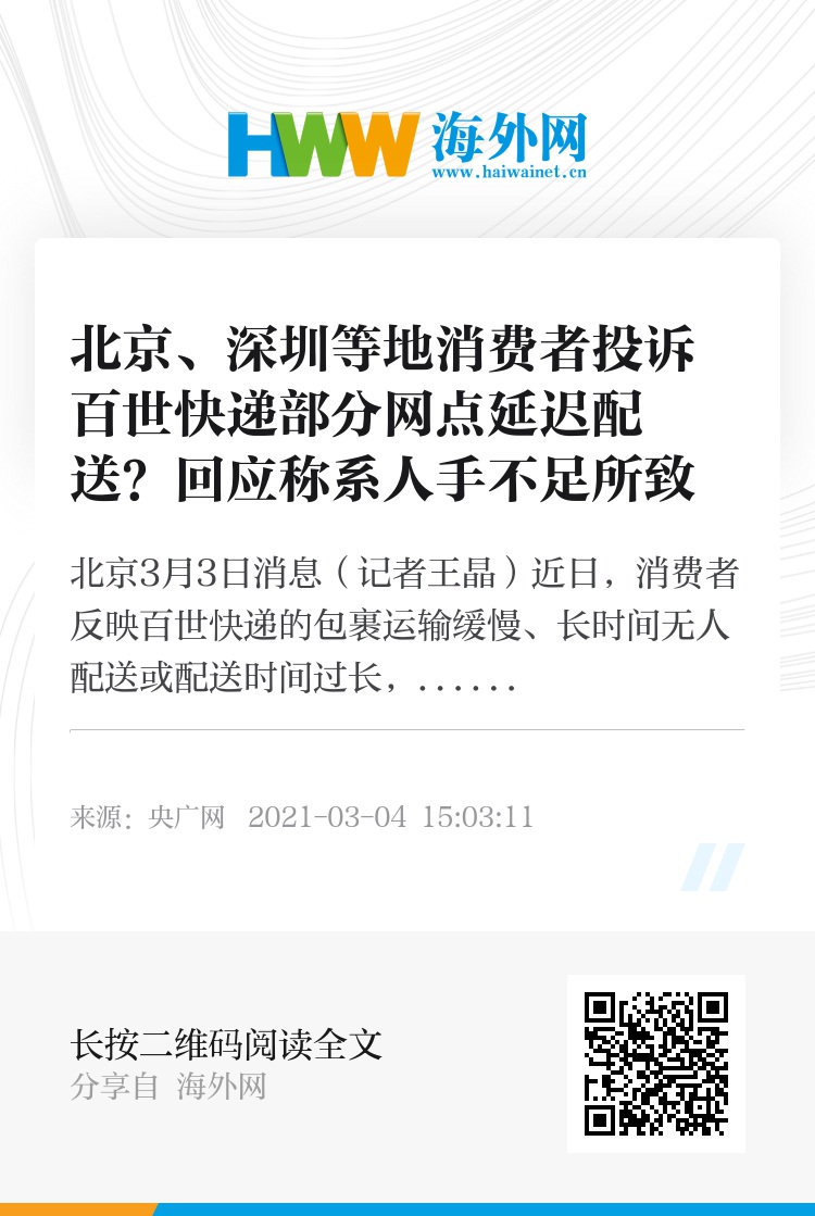 3月3日下午,百世快递方面回应央广网记者称,春节前后,快递件量大幅增加,导致个别网点出现人手不足的问题,所涉网点已做调整,并增加人手加紧派送。