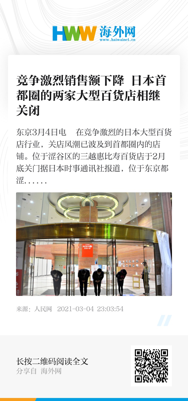 人民网东京3月4日电 在竞争激烈的日本大型百货店行业,关店风潮已波及到首都圈内的店铺。