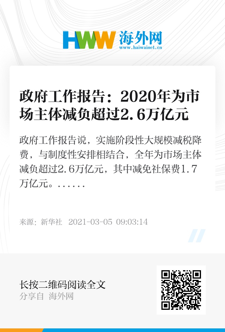 32008058,.政府工作报告:2020年为市场主体减负超过2.6万亿元,.2021-03-05 09:11:46,.204309,.陈亚楠