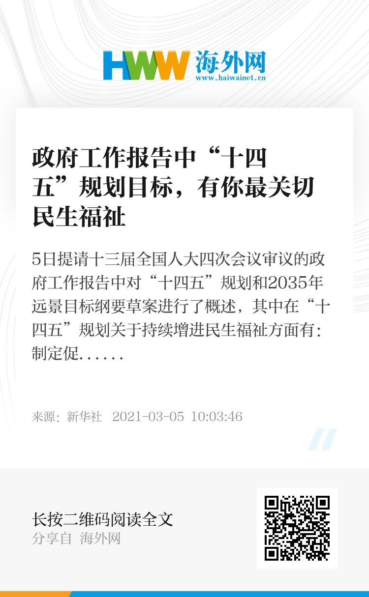 5日提请十三届全国人大四次会议审议的政府工作报告中对“十四五”规划和2035年远景目标纲要草案进行了概述,其中在“十四五”规划关于持续增进民生福祉方面有:制定促进共同富裕行动纲要;实施就业优先战略,扩大就业容量;居民人均可支配收入增长与国内生产总值增长基本同步;建设高质量教育体系,实施教育提质扩容工程,劳动年龄人口平均受教育年限提高到11.3年;全面推进健康中国建设,人均预期寿命再提高1岁;实施积极应对人口老龄化国家战略,推动实现适度生育水平,逐步延迟法定退休年龄;健全多层次社会保障体系,基本养老保险参保率提高到95%。(海报设计:贾伊宁)