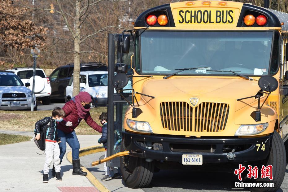 自3月1日开始,美国弗吉尼亚州阿灵顿县公立中小学允许学生自愿选择返校复课。当地学校目前采取“3天网课+2天到校”等不同形式,让校园恢复到“半开放”状态。图为阿灵顿一所小学4日迎来学生返校的第一天。 中新社记者 陈孟统 摄
