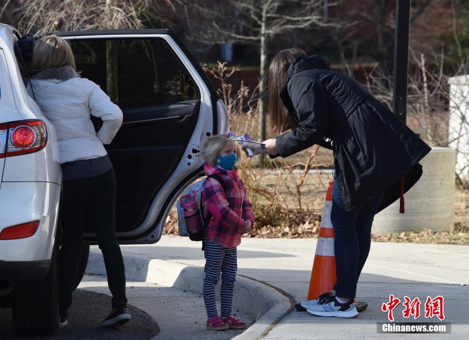 自3月1日开始,美国弗吉尼亚州阿灵顿县公立中小学允许学生自愿选择返校复课。当地学校目前采取“3天网课+2天到校”等不同形式,让校园恢复到“半开放”状态。图为阿灵顿一所小学4日迎来学生返校的第一天。 中新社记者 陈孟统 摄