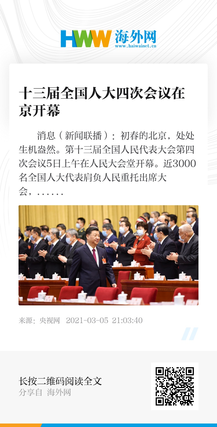 央视网消息(新闻联播):初春的北京,处处生机盎然。第十三届全国人民代表大会第四次会议5日上午在人民大会堂开幕。近3000名全国人大代表肩负人民重托出席大会,认真履行宪法和法律赋予的神圣职责。